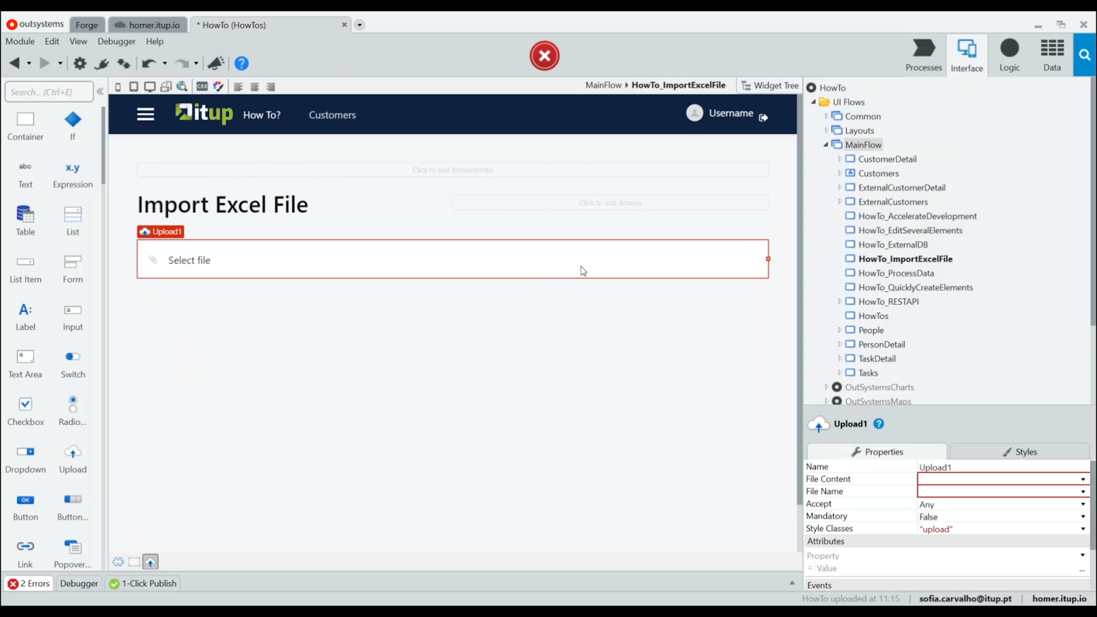 Drag and drop the upload widget that you can find in the widget tree. Then set variables to store the file and the file name.